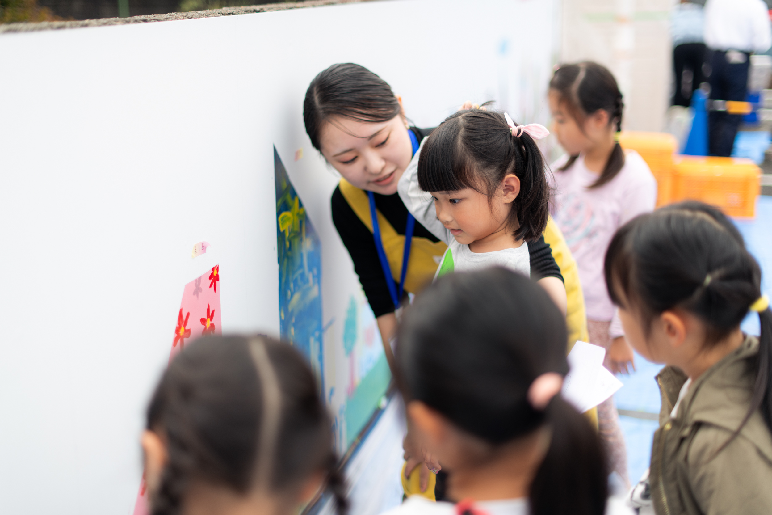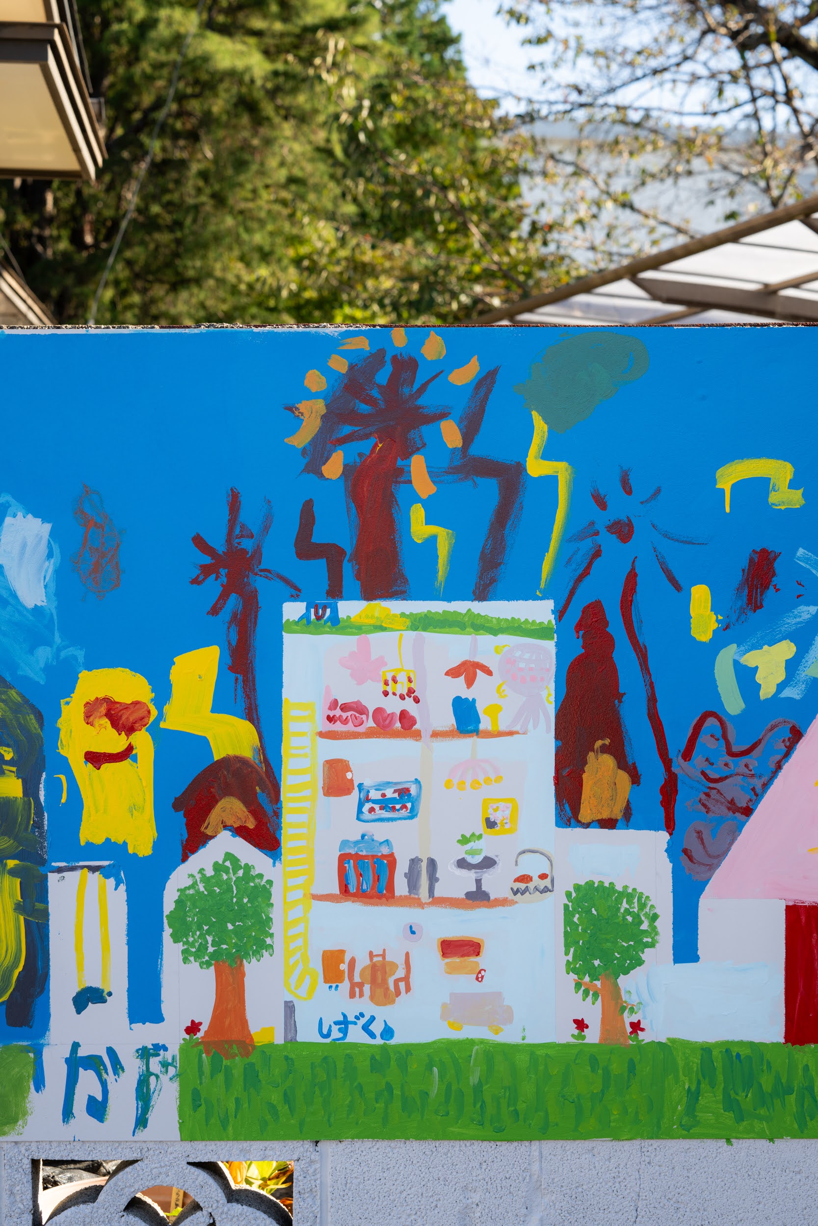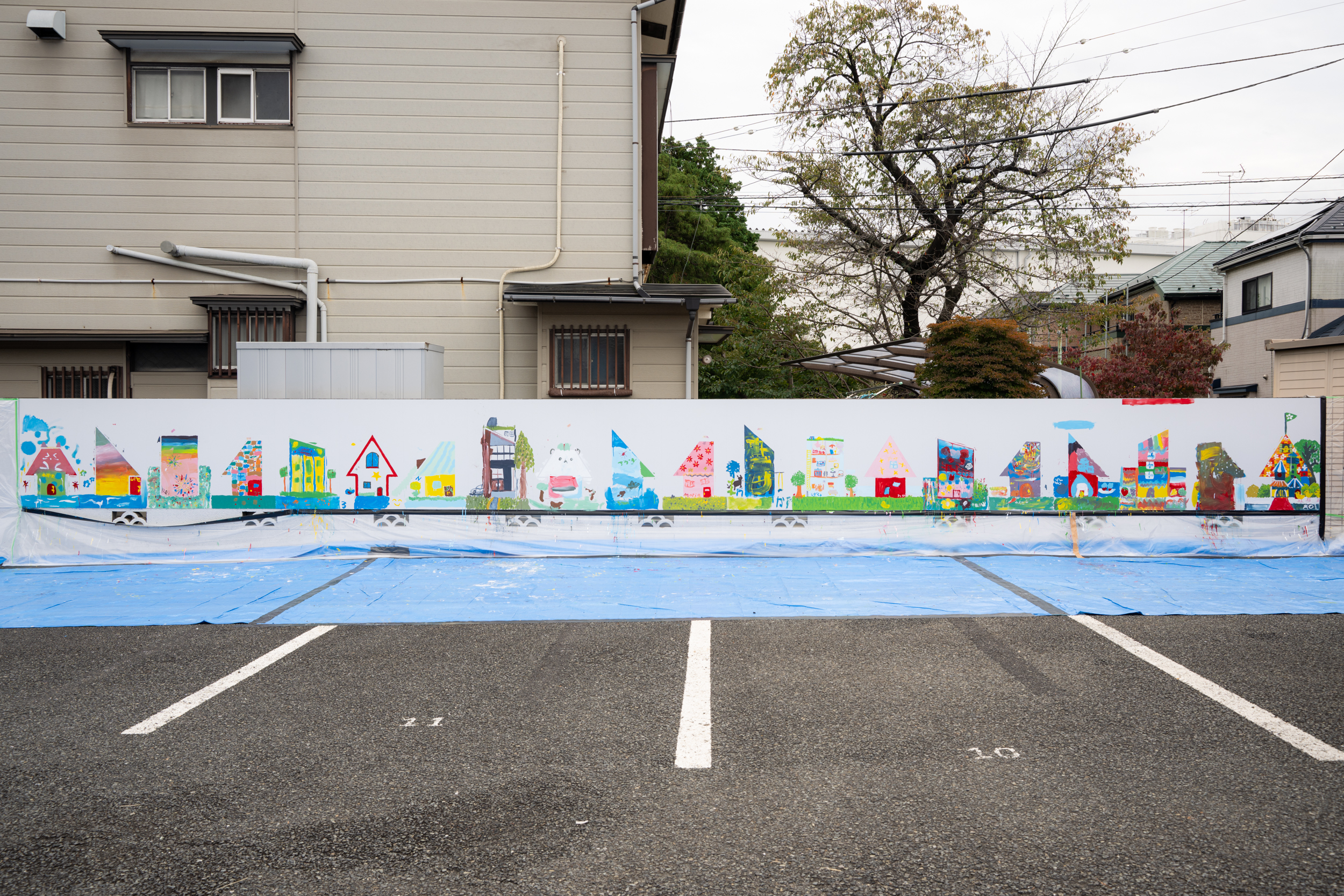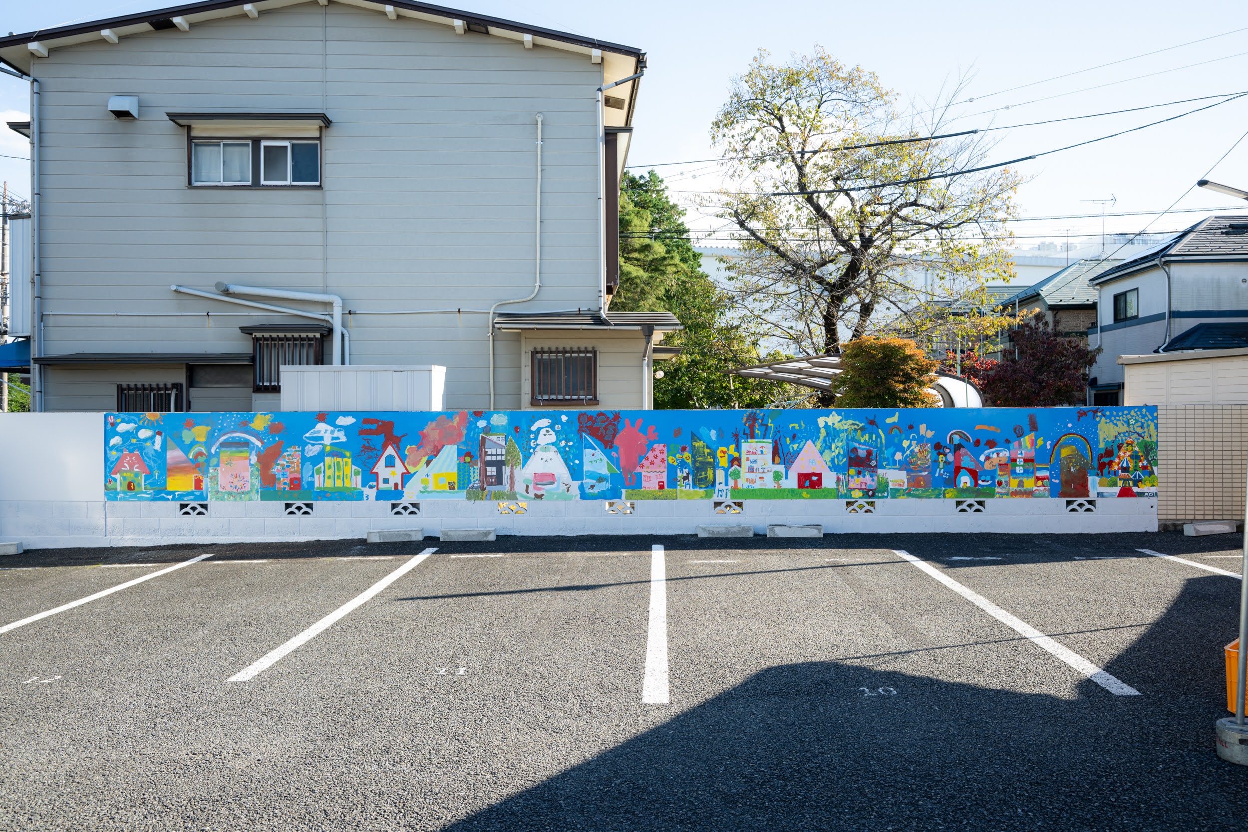 の本社の駐車場にある長〜い壁に、ちびっ子が絵を描きました。