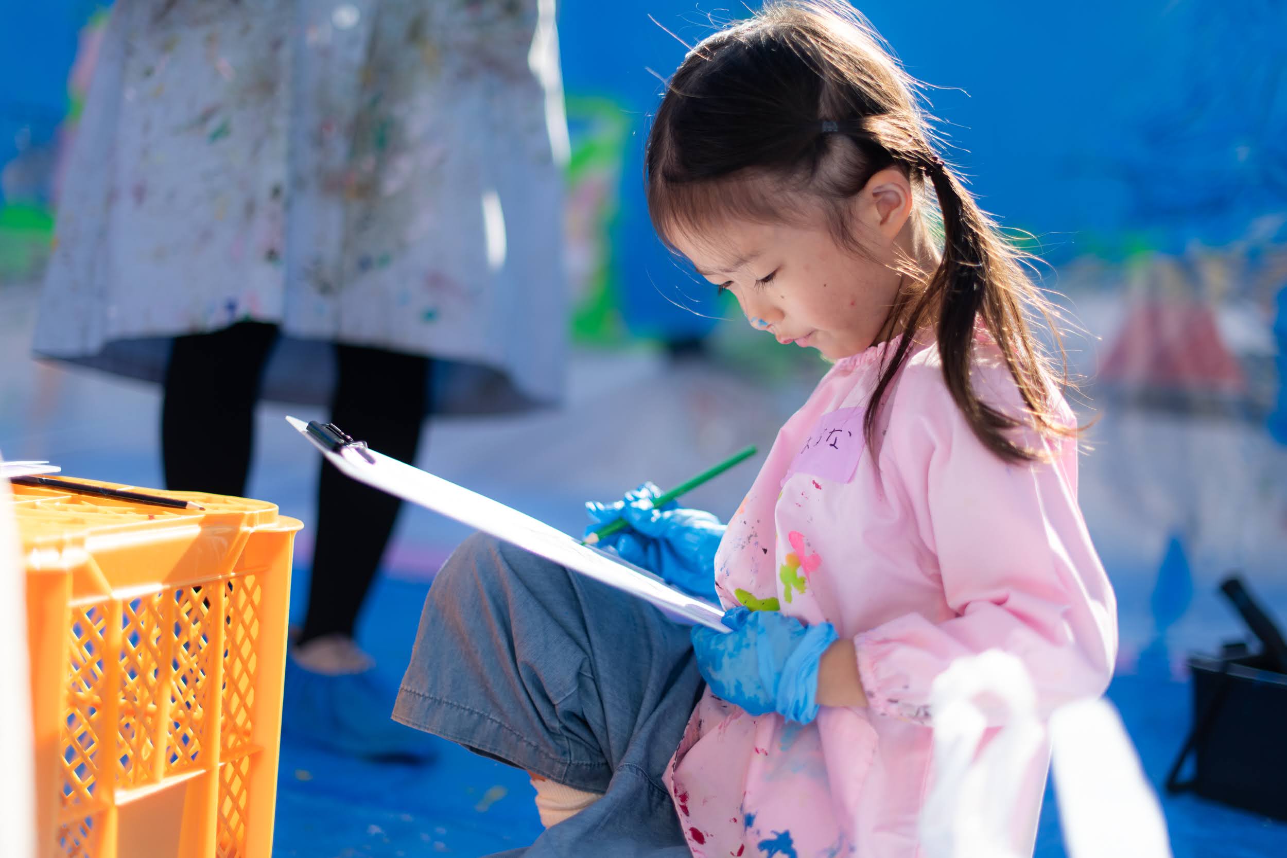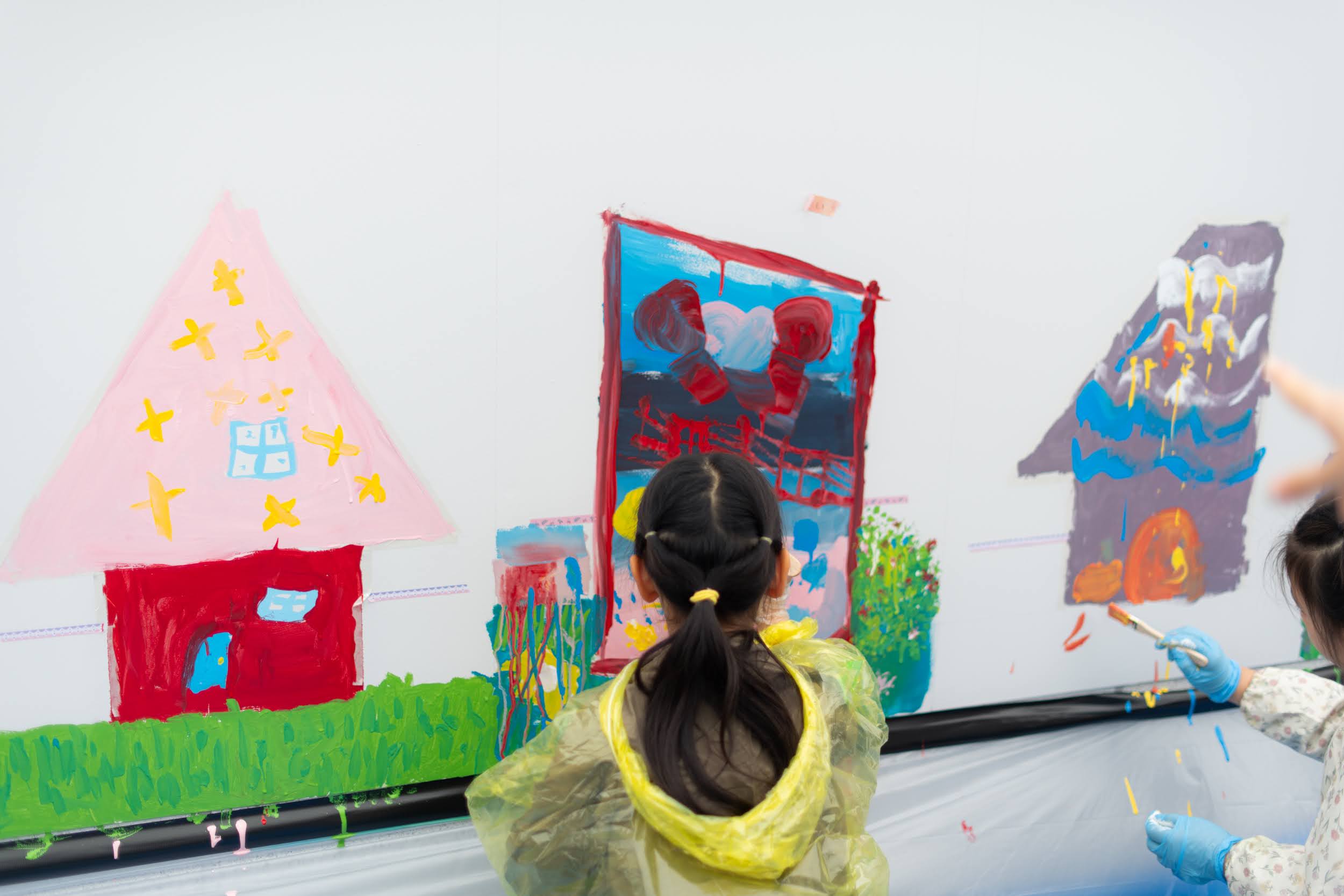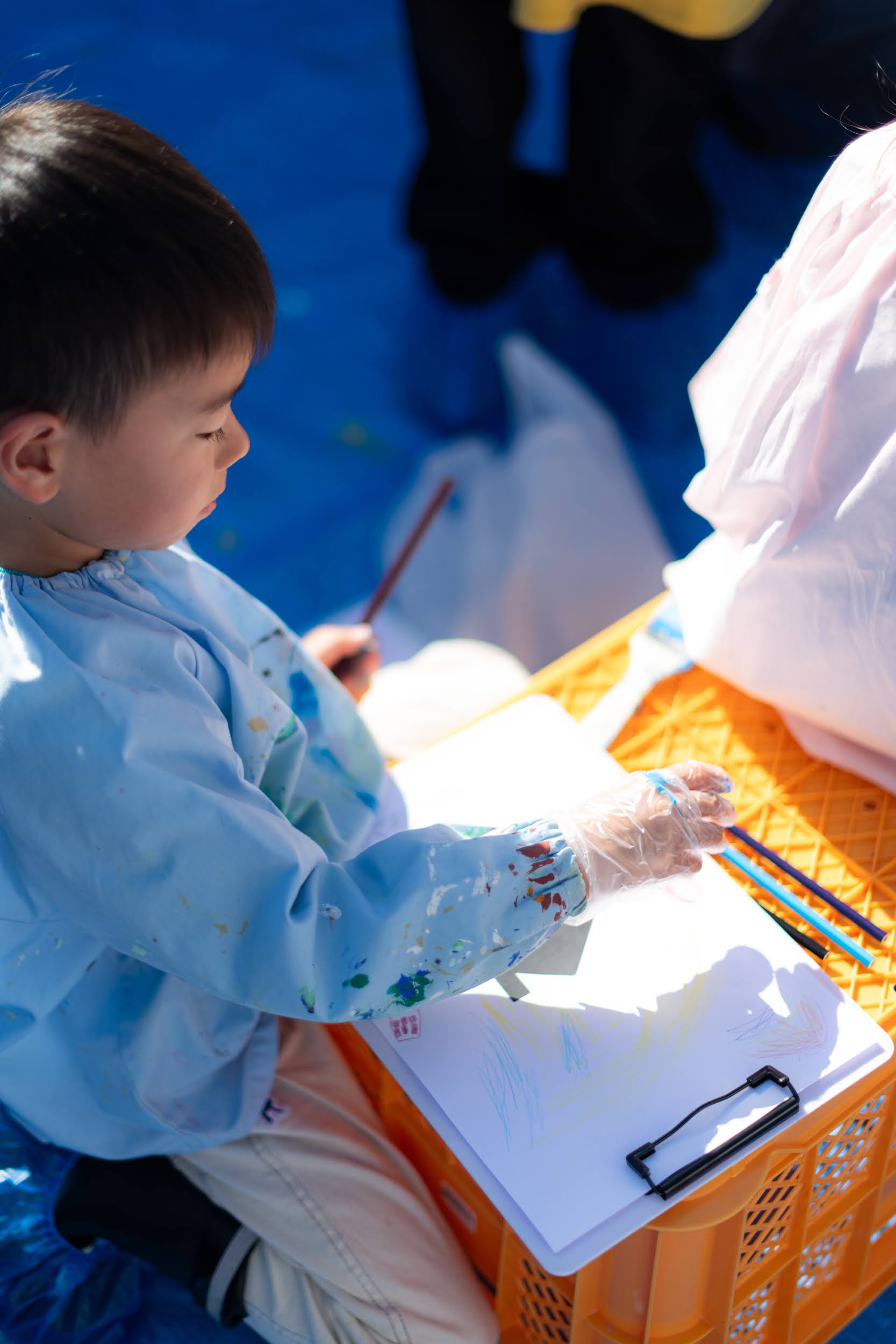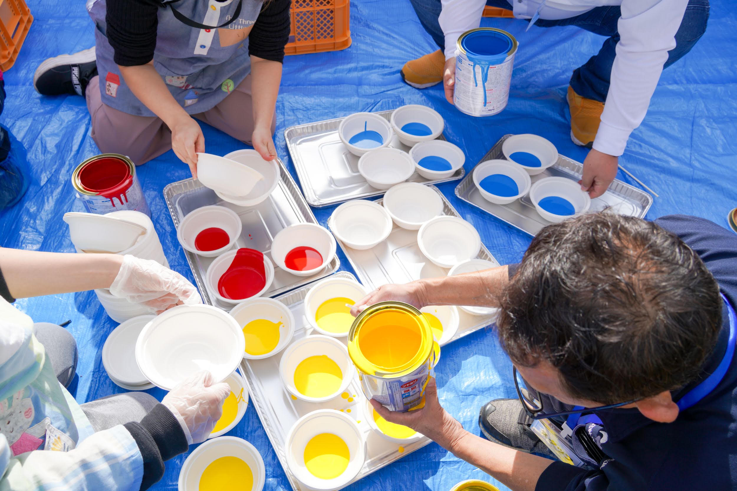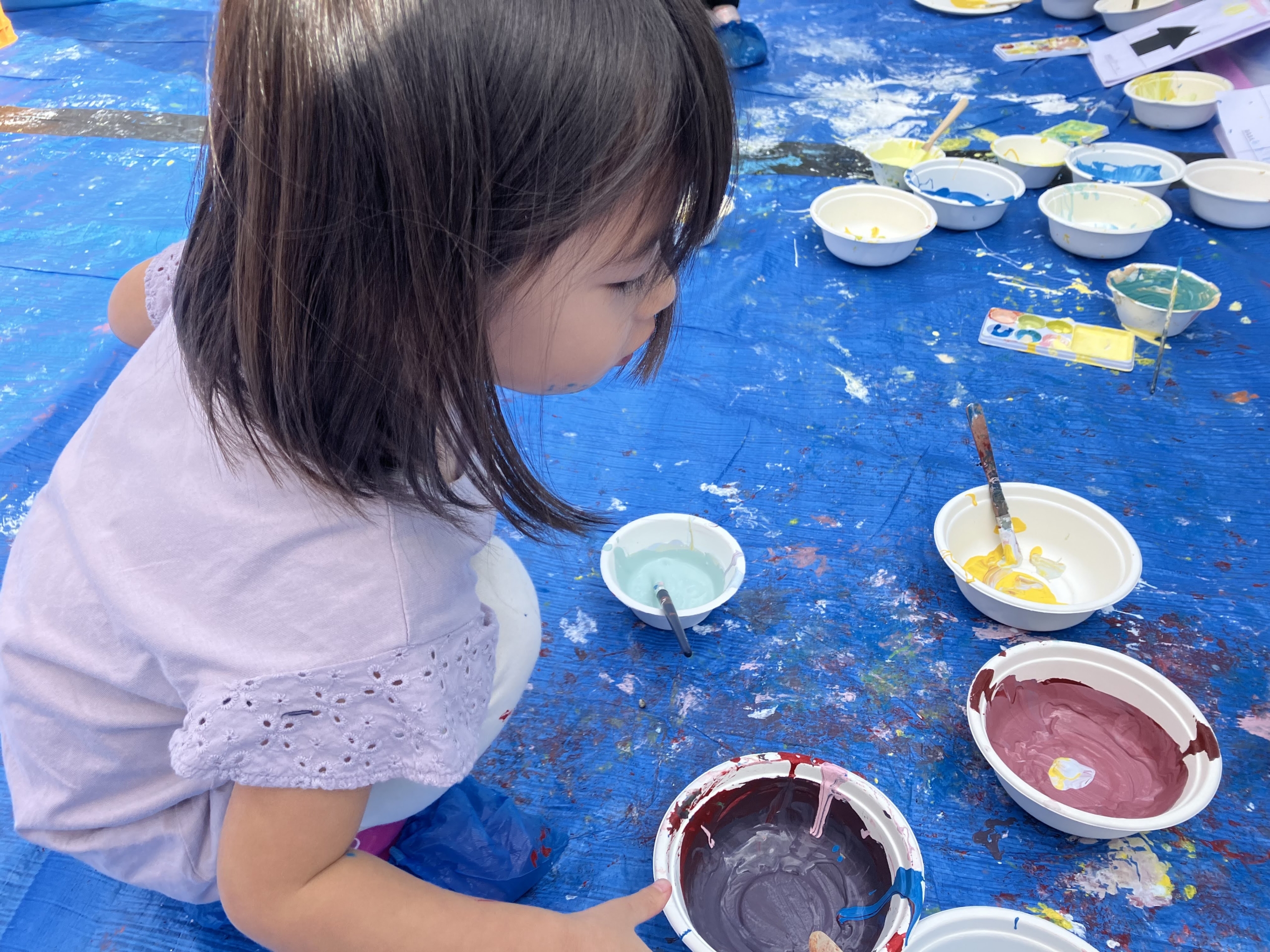 赤・青・黄色のペンキがそれぞれのちびっこに配られると制作開始!です。